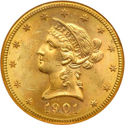 1901-S $10 Liberty. NGC graded MS-63. Sparkling with mint luster. Gorgeous golden orange and greenish-gold tones add to the eye appeal quite well (PCGS # 8749) .