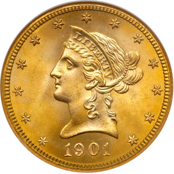 1901-S. NGC graded MS-67 PQ. A stunning gem example displaying near immaculate surfaces and deeper golden overtones and the luster radiates to the borders. An inspiring example of this plentiful date, and one in the finest condition yet seen by the two major grading services. Note the finely textured luster in the fields along with the superb quality of the devices and fields where virtually no handling signs appear. Close examination with a loupe will locate oceans of smooth flowing luster, meaning that this ’01-S Eagle is far and away finer than virtually all competing examples of this date and mint. Truly an outstanding coin, one any collector will be proud to display and own of this delightful slice of golden Americana. A Premium Quality coin for the grade. Pop 23; 1 finer in 67* (PCGS # 8749) .