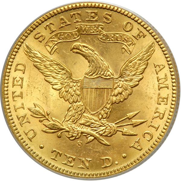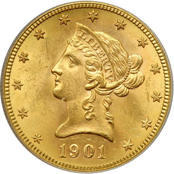 1901-S $10 Liberty. PCGS graded MS-63+. Lovely rich golden toning over gleaming fields and devices (PCGS # 8749) .