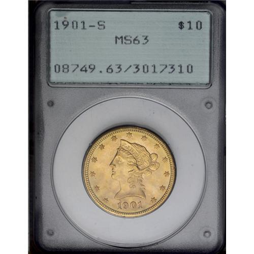 <B>1901-S<$10> MS63 PCGS.</B></I> A highly lustrous example that displays intricate detail. This piece has the scattered marks one would expect for the grade, including a few in prime focal areas. Housed in an early holder.