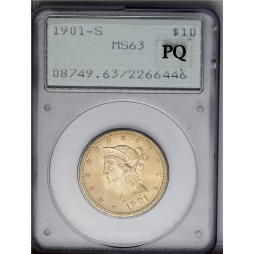 <B>1901-S<$10> MS63 PCGS.</B></I> A lustrous and original peach-gold type coin that has the general appearance of a finer grade despite minor striking softness on the final two stars. A cluster of tiny marks is noted between stars 8 and 9. Housed in a first generation PCGS holder.