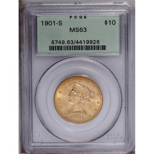 <B>1901-S<$10> MS63 PCGS.</B></I> This lustrous type coin features rich, original mustard-gold toning. The strike is exacting, and although small marks are present, none distract the eye.