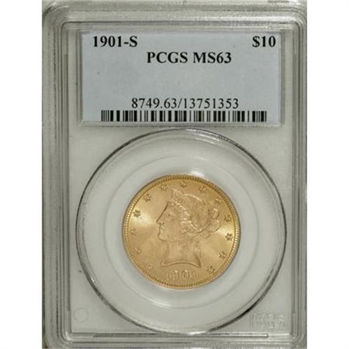 <B>1901-S $10 MS63 PCGS.</B></I> PCGS Population (3988/3405). NGC Census: (3621/4393). Mintage: 2,812,750. Numismedia Wsl. Price for NGC/PCGS coin in MS63: $820. (#8749)<BR><BR><B>Coin Engraver:</B> Christian Gobrecht<BR><BR><b>Shipping:</b> Coins & Currency (<a target="_blank" href="http://www.heritageauctions.com/common/shipping.php">view shipping information</a>)