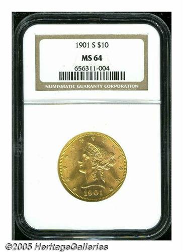 <B>1901-S<$10> MS64 NGC.</B></I> Attractive near-Gem with shimmering luster, even orange-golden surfaces and relatively few distractions for the grade.