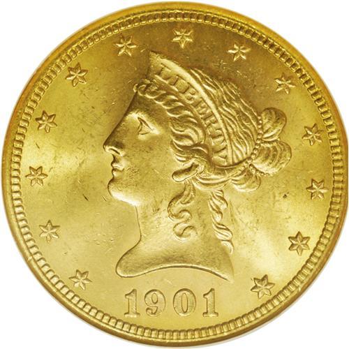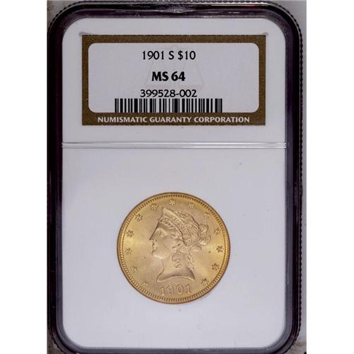 <B>1901-S<$10> MS64 NGC.</B></I> Fully struck with highly lustrous, minimally abraded surfaces. Some olive color is seen in the fields, and a deep golden border is seen on each side. An excellent choice for a gold type set.