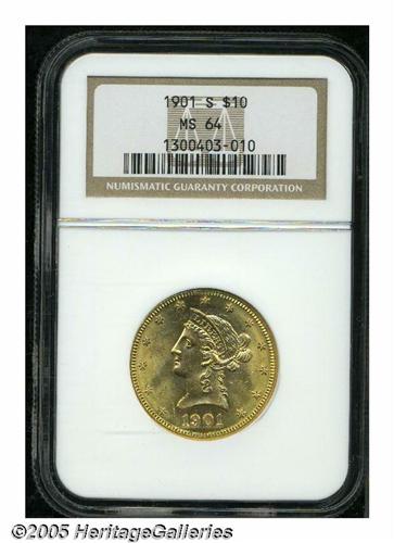 <B>1901-S<$10> MS64 NGC.</B></I> Satiny in finish, the bright yellow-gold features are sharply struck with no singularly mentionable distractions.