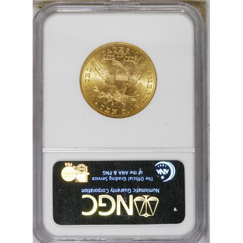 <B>1901-S<$10> MS64 NGC.</B></I> The generous mintage, in excess of 2.8 million pieces, ensures a steady supply of high-quality survivors, and this piece is no exception. A few light scrapes and abrasions are consistent with the near-Gem assessment, but the cartwheel luster is radiant from the orange-gold surfaces, and the strike is full. Both dies are in late states, with numerous die cracks visible, more prominently on the reverse, likely the result of die-economy measures at the San Francisco Mint. An appealing piece!