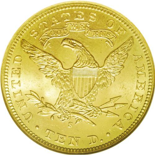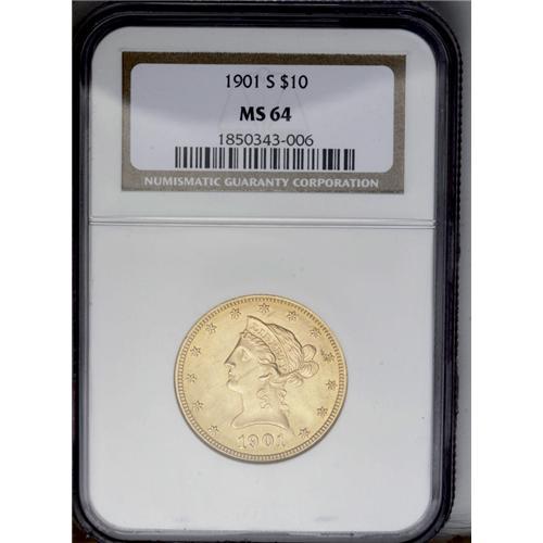 <B>1901-S<$10> MS64 NGC.</B></I> This is a high quality example whose green-gold surfaces are nearly blemish-free from rim to rim. Some pale, yellow-gold patina has gathered at the centers of this fully lustrous and satiny near-Gem.