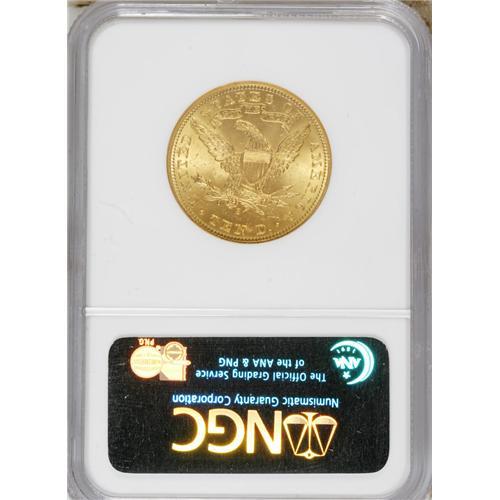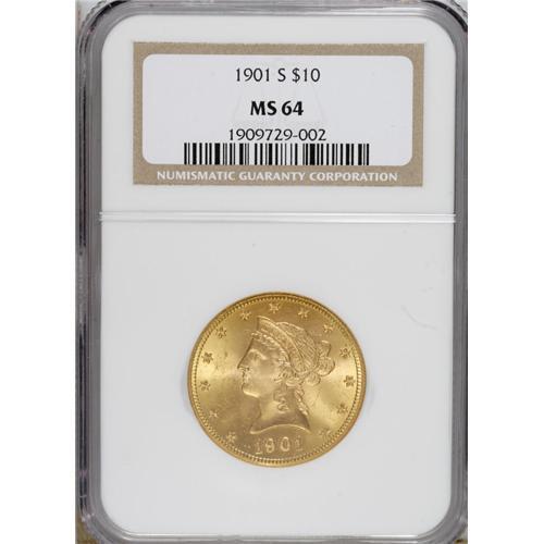 <B>1901-S $10 MS64 NGC.</B></I> This is one of the most common dates in the series, with several thousand certified Mint State specimens. Dazzling luster radiates from the apricot-gold surfaces of this near-Gem example, and all of the design features are well struck. Some inoffensive handling marks limit the grade.<BR><BR><b>Shipping:</b> Coins & Currency (<a target="_blank" href="http://www.heritageauctions.com/common/shipping.php">view shipping information</a>)