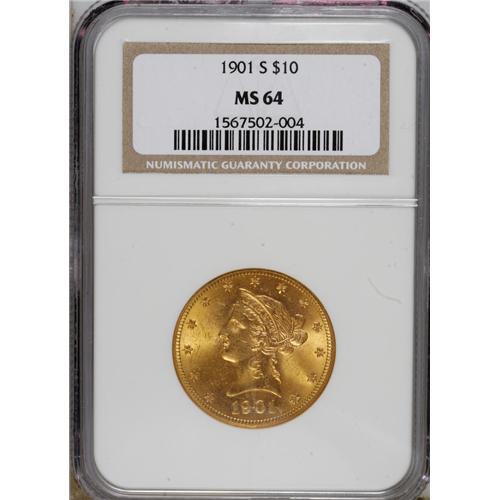 <B>1901-S $10 MS64 NGC.</B></I> This splendidly smooth near-Gem is meticulously struck save for a hint of softness on the forehead curls. The field above the right (facing) shoulder has a minor mint-made strike-through.<BR><BR><b>Shipping:</b> Coins & Currency (<a target="_blank" href="http://www.heritageauctions.com/common/shipping.php">view shipping information</a>)