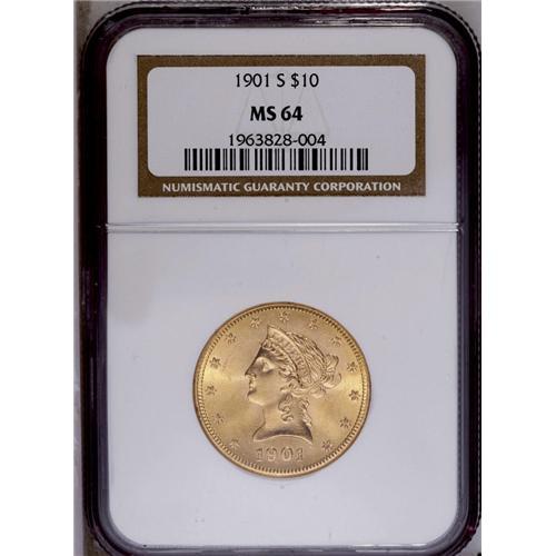 <B>1901-S<$10> MS64 NGC.</B></I> This thoroughly lustrous and well struck type coin is delightful for the grade despite a few faint mint-made roller marks on the chin and the upper reverse.