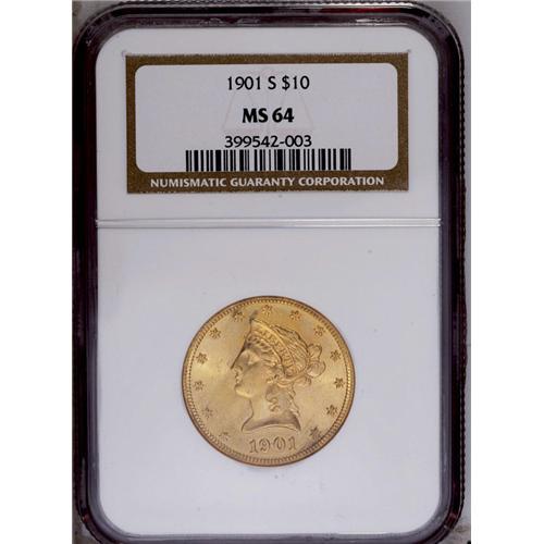 <B>1901-S<$10> MS64 NGC.</B></I> This well struck near-Gem features green-gold and apricot tones. A hidden mark is on the base of Liberty's shoulder, otherwise an impressive representative of the 20th century gold type.