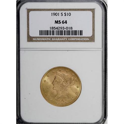 <B>1901-S $10 MS64 NGC.</B></I> A precisely struck and highly lustrous type representative that boasts a minimally abraded reverse and only minor obverse grazes. The colors are typically of an original 20th century gold coin, with pumpkin-gold centers and green-gold peripheries.<BR><BR><B>Coin Engraver:</B> Christian Gobrecht<BR><BR><b>Shipping:</b> Coins & Currency (<a target="_blank" href="http://www.heritageauctions.com/common/shipping.php">view shipping information</a>)