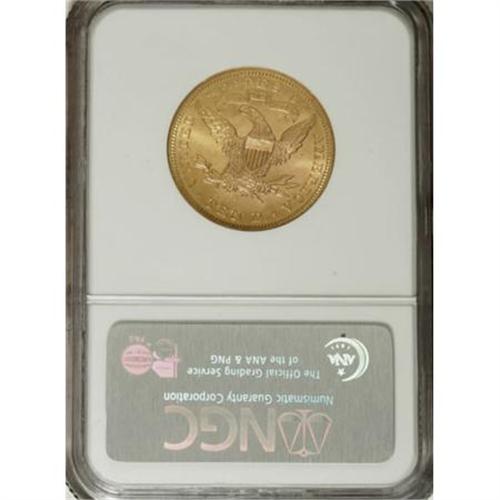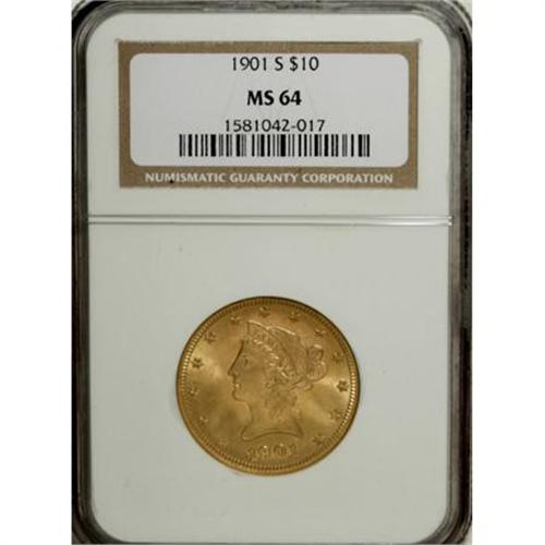 <B>1901-S $10 MS64 NGC.</B></I> Dazzling luster emanates from both sides of this near-Gem S-mint coin, and rich yellow-gold patination is laced with traces of light tan. A few minute obverse marks preclude full Gem classification.<BR><BR><B>Coin Engraver:</B> Christian Gobrecht<BR><BR><b>Shipping:</b> Coins & Currency (<a target="_blank" href="http://www.heritageauctions.com/common/shipping.php">view shipping information</a>)