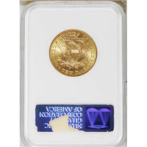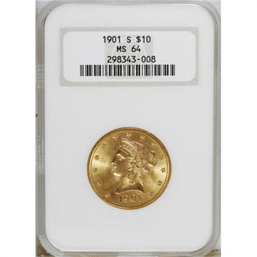 <B>1901-S $10 MS64 NGC.</B></I> An extremely clean near-Gem with rich orange-gold color and a bold strike. The highest points on the devices display a slight glossiness that contrasts nicely with the satiny fields. A highly attractive example for type purposes. Housed in an older-style NGC holder.<BR><BR><B>Coin Engraver:</B> Christian Gobrecht<BR><BR><b>Shipping:</b> Coins & Currency (<a target="_blank" href="http://www.heritageauctions.com/common/shipping.php">view shipping information</a>)