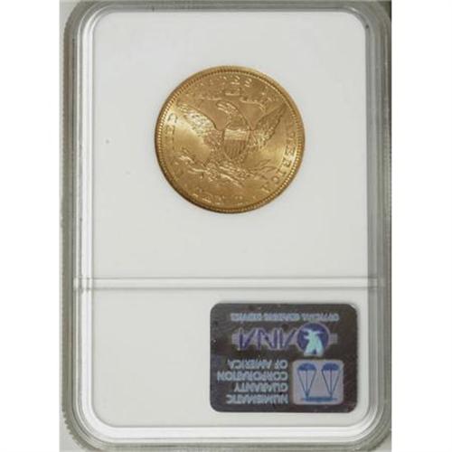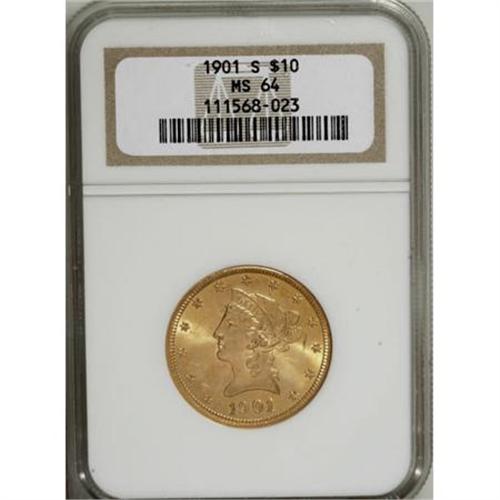 <B>1901-S $10 MS64 NGC.</B></I> Bright lemon-gold toning and booming luster proclaim the charm of this well struck Choice type coin. Liberty's cheek has a couple of hair-thin marks, but the overall preservation is appealing.<BR><BR><B>Coin Engraver:</B> Christian Gobrecht<BR><BR><b>Shipping:</b> Coins & Currency (<a target="_blank" href="http://www.heritageauctions.com/common/shipping.php">view shipping information</a>)