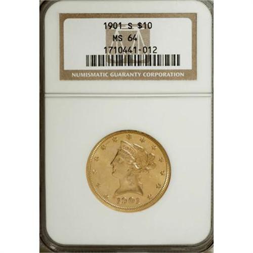 <B>1901-S $10 MS64 NGC.</B></I> This Liberty gold type coin is prooflike, although it is unlabelled as such on the insert because its holder generation predates the NGC Prooflike designation for gold. The flashy fields are lightly abraded, and Liberty's hair has only inconspicuous contact.<BR><BR><B>Coin Engraver:</B> Christian Gobrecht<BR><BR><b>Shipping:</b> Coins & Currency (<a target="_blank" href="http://www.heritageauctions.com/common/shipping.php">view shipping information</a>)