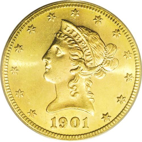 <B>1901-S<$10> MS64 PCGS.</B></I> Breen-7075. The date was initially entered with a slightly rising slant, then was correctly repunched. Evidence of the first logotype impression is prominent beneath the base of the first 1. This handsome and luminous sun-gold representative lacks remotely mentionable marks, and the strike is definitive, even on the curl above the ear.