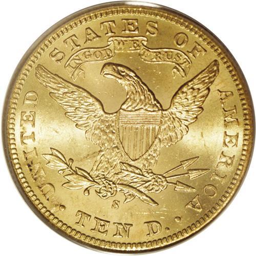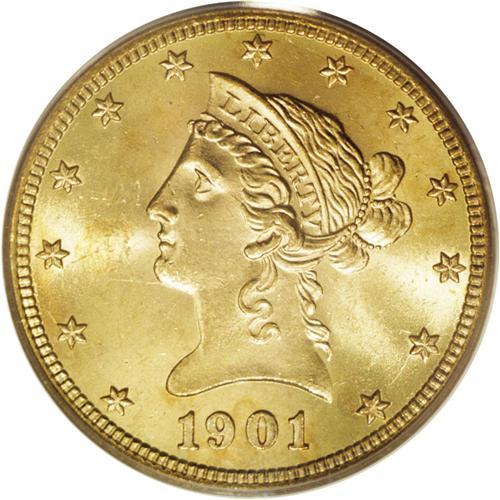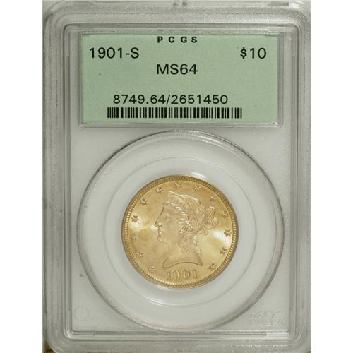 <B>1901-S $10 MS64 PCGS.</B></I> Fully lustrous and sharply struck. This example exhibits yellow-gold with small areas of apricot toning. The designs are distinct and the fields relatively free of abrasions and marks. A solid graded near-Gem coin that will please the successful bidder.<BR><BR><b>Shipping:</b> Coin/Currency (<a target="_blank" href="http://www.heritageauctions.com/common/shipping.php">view shipping information</a>)