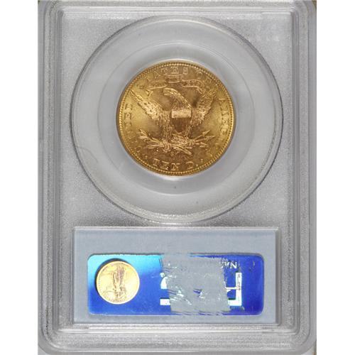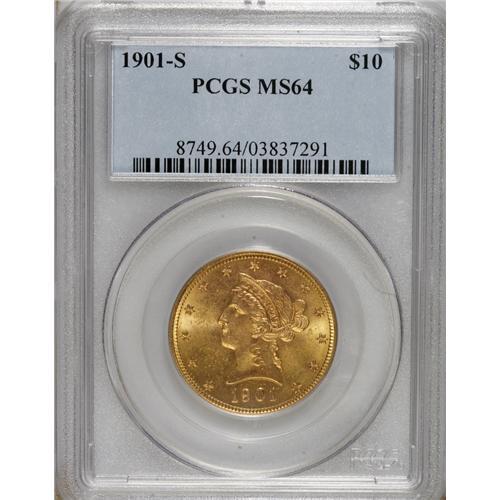 <B>1901-S $10 MS64 PCGS.</B></I> Much of the nearly 3 million-piece mintage has apparently survived, making the 1901-S one of the most common dates in the Liberty Head ten dollar series. Sharp definition graces lustrous peach-gold surfaces imbued with traces of light green. A few minuscule marks define the grade.<BR><BR><b>Shipping:</b> Coins & Currency (<a target="_blank" href="http://www.heritageauctions.com/common/shipping.php">view shipping information</a>)