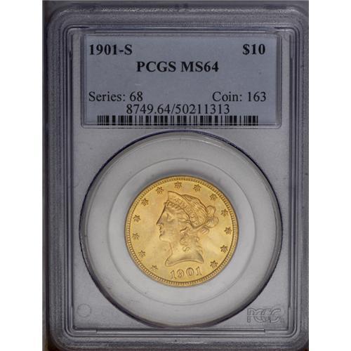 <B>1901-S<$10> MS64 PCGS.</B></I> Peach-gold fields and devices are framed by peripheral lime hues. Dazzling luster further ensures the eye appeal. This well struck example has a beautifully preserved reverse, and the obverse only displays moderate contact.
