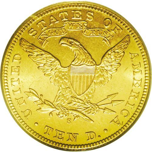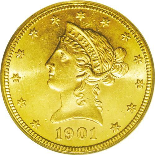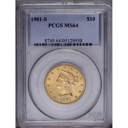 <B>1901-S<$10> MS64 PCGS.</B></I> Razor sharp with shimmering mint brilliance, being removed from consideration as a Gem by a number of well scattered, light field marks. Some pale green patina is seen on each side.