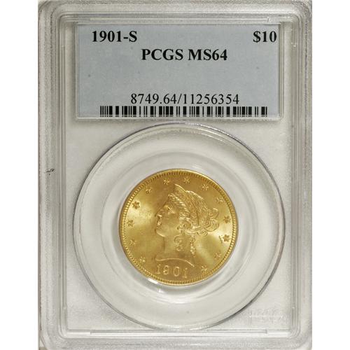<B>1901-S $10 MS64 PCGS.</B></I> This thoroughly lustrous near-Gem features peach centers and lime borders. The strike is unimprovable, and the reverse is gorgeously smooth.<BR><BR><b>Shipping:</b> Coins & Currency (<a target="_blank" href="http://www.heritageauctions.com/common/shipping.php">view shipping information</a>)