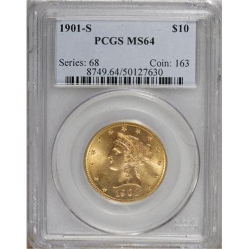 <B>1901-S $10 MS64 PCGS.</B></I> The 0 in the date is repunched south. This thoroughly lustrous Choice gold type coin is well struck and pleasing despite a hair-thin mark beneath the left (facing) claw.<BR><BR><b>Shipping:</b> Coins & Currency (<a target="_blank" href="http://www.heritageauctions.com/common/shipping.php">view shipping information</a>)