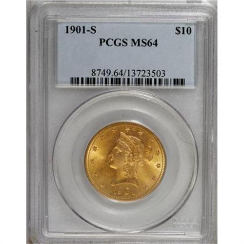 <B>1901-S $10 MS64 PCGS.</B></I> The 01 in the date is minutely repunched at the bases. Rich orange centers are bounded by lime margins. This suitably struck and lustrous near-Gem is void of consequential marks.<BR><BR><B>Coin Engraver:</B> Christian Gobrecht<BR><BR><b>Shipping:</b> Coins & Currency (<a target="_blank" href="http://www.heritageauctions.com/common/shipping.php">view shipping information</a>)