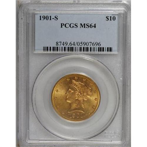 <B>1901-S $10 MS64 PCGS.</B></I> Crisply struck with a hint of flash beneath subtle haze. The minimally marked apricot-gold fields show subtle orange accents. A lovely example from this later Liberty issue.<BR><BR><B>Coin Engraver:</B> Christian Gobrecht<BR><BR><b>Shipping:</b> Coins & Currency (<a target="_blank" href="http://www.heritageauctions.com/common/shipping.php">view shipping information</a>)