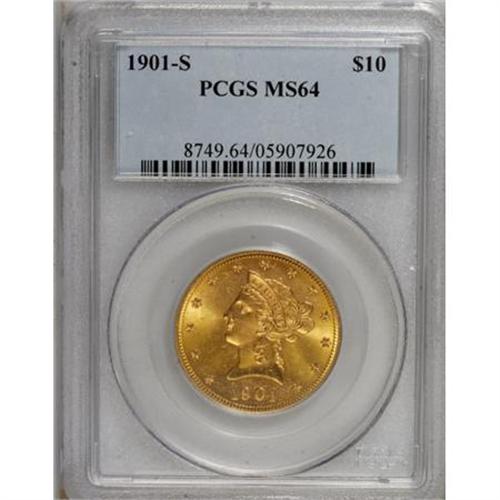 <B>1901-S $10 MS64 PCGS.</B></I> The central devices of this S-mint eagle show strong detail, though the stars show slight softness. Vibrant luster enlightens the yellow-gold devices, which show occasional glints of green.<BR><BR><B>Coin Engraver:</B> Christian Gobrecht<BR><BR><b>Shipping:</b> Coins & Currency (<a target="_blank" href="http://www.heritageauctions.com/common/shipping.php">view shipping information</a>)