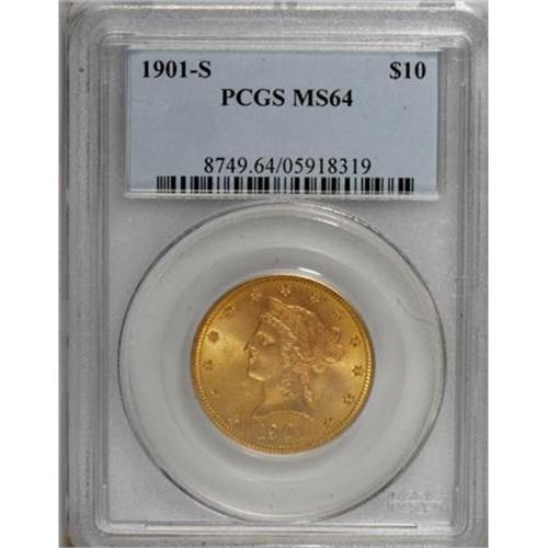 <B>1901-S $10 MS64 PCGS.</B></I> Whispers of greenish-gray are splashed over lustrous, apricot-gold surfaces that exhibit sharply struck design elements. A few minute marks determine the grade.<BR><BR><B>Coin Engraver:</B> Christian Gobrecht<BR><BR><b>Shipping:</b> Coins & Currency (<a target="_blank" href="http://www.heritageauctions.com/common/shipping.php">view shipping information</a>)