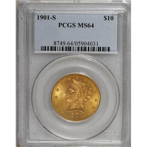 <B>1901-S $10 MS64 PCGS.</B></I> Solidly struck with vibrant luster and a touch of granularity on the sun-gold obverse. Minimally marked with a hint of haze on each side, a lovely example of this turn-of-the-century West Coast issue.<BR><BR><B>Coin Engraver:</B> Christian Gobrecht<BR><BR><b>Shipping:</b> Coins & Currency (<a target="_blank" href="http://www.heritageauctions.com/common/shipping.php">view shipping information</a>)