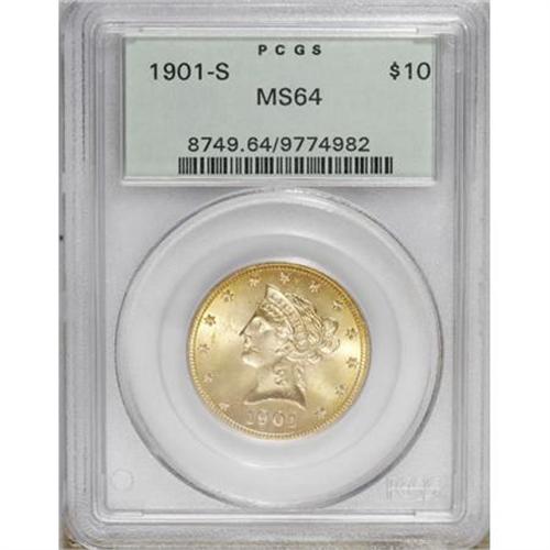 <B>1901-S $10 MS64 PCGS.</B></I> This precisely struck Liberty ten has magnificent luster and lovely canary-gold toning. A small mark near the mouth, but otherwise well preserved. Encased in a green label holder.<BR><BR><B>Coin Engraver:</B> Christian Gobrecht<BR><BR><b>Shipping:</b> Coins & Currency (<a target="_blank" href="http://www.heritageauctions.com/common/shipping.php">view shipping information</a>)