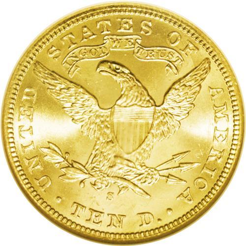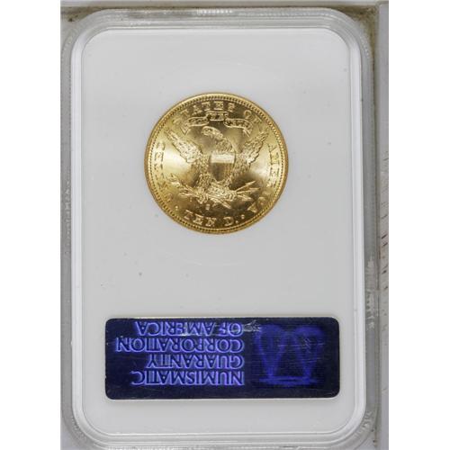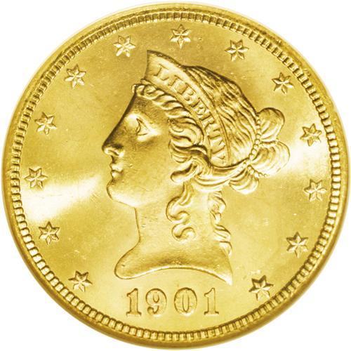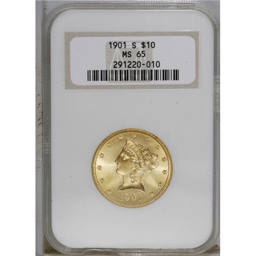 <B>1901-S<$10> MS65 NGC.</B></I> Broad repunching is noted on the base of the first 1 in the date. This visually arresting Gem displays flashy cartwheel luster and lovely honey-gold coloration. The striking details are impeccable on both sides, and, but for the presence of a few wispy blemishes, this piece would undoubtedly grade even higher. Housed in an early generation NGC holder.