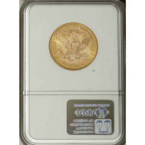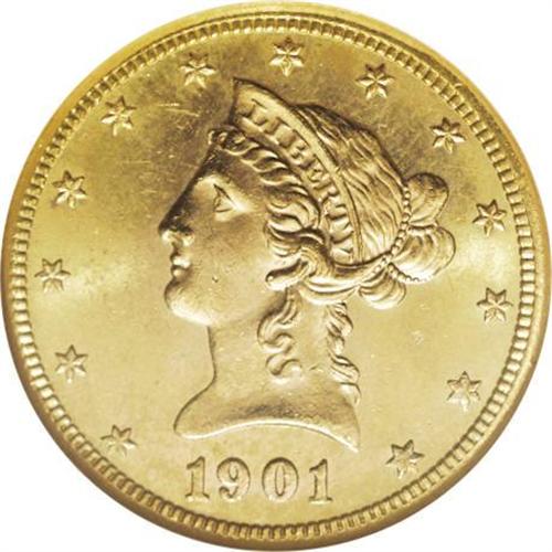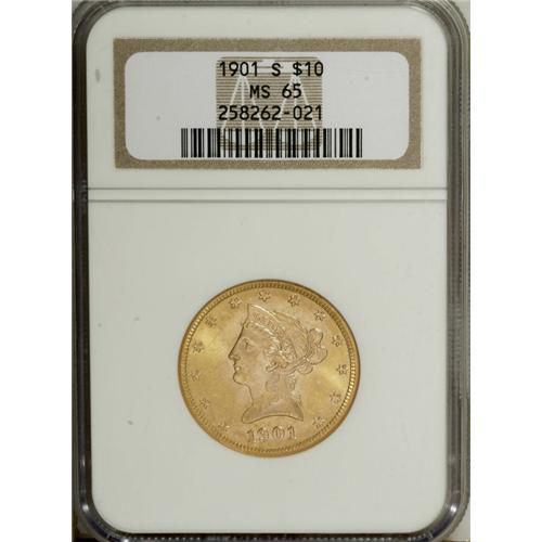 <B>1901-S $10 MS65 NGC.</B></I> The most common date in the series, not a bad thing since its enormous mintage enables the survival of radiant Gem coins such as the present piece. The light yellow-orange surfaces on each side beam forth superlative cartwheel luster that complements the bold strike and huge eye appeal. Only scattered, light field marks preclude an even finer grade.<BR><BR><b>Shipping:</b> Coins & Currency (<a target="_blank" href="http://www.heritageauctions.com/common/shipping.php">view shipping information</a>)