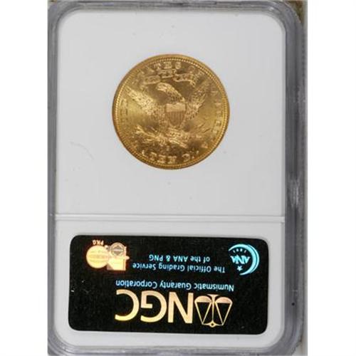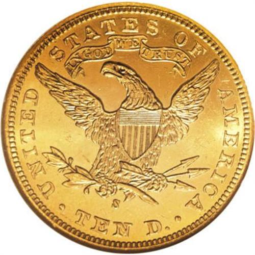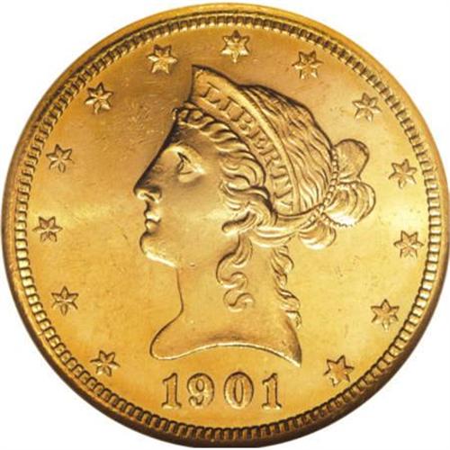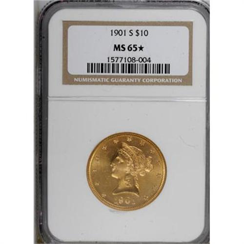 <B>1901-S $10 MS65 </B></I> S<B> NGC.</B></I> The star designation represents superior eye appeal for the grade, and that is immediately obvious when one views this piece. The fields appear to have been struck either from polished dies or the planchet was polished prior to striking. The obverse is fully prooflike and the reverse is just a bit less so. Star 13 is the only area that prevents a full strike designation. The warm, orange-gold surfaces show a few minor marks, which seem unjustly magnified in importance by the bright prooflike fields. One of only two pieces given the <img border='0' src='http://www.heritagecoins.com/images/star.gif' width=10 height=10> designation at the MS65 level with five other <img border='0' src='http://www.heritagecoins.com/images/star.gif' width=10 height=10> coins in MS66 and 67 grades (8/07).<BR><BR><B>Coin Engraver:</B> Christian Gobrecht<BR><BR><b>Shipping:</b> Coins & Currency (<a target="_blank" href="http://www.heritageauctions.com/common/shipping.php">view shipping information</a>)