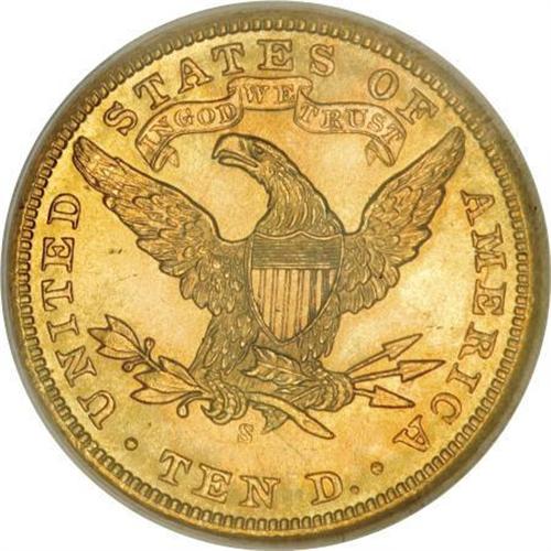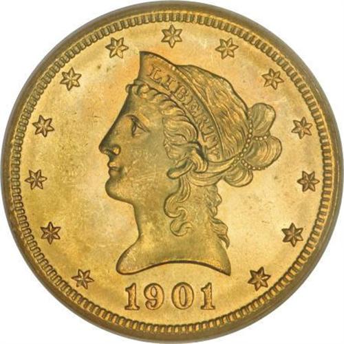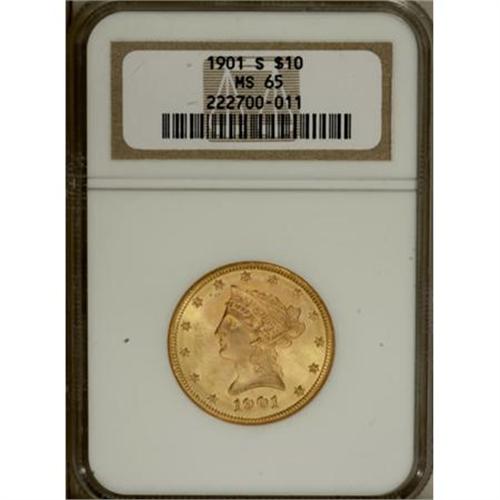 <B>1901-S $10 MS65 NGC.</B></I> Vibrant cartwheel luster and beautiful lime-green and peach-gold toning ensure the splendid eye appeal of this Gem gold eagle. Flashy and nicely preserved, with just a few minor abrasions on the obverse and razor-sharp striking details throughout; it would be difficult to find a more visually enticing example of this San Francisco Mint issue. <BR><I>From The Florissant Collection.</B></I><BR><BR><B>Coin Engraver:</B> Christian Gobrecht<BR><BR><b>Shipping:</b> Coins & Currency (<a target="_blank" href="http://www.heritageauctions.com/common/shipping.php">view shipping information</a>)