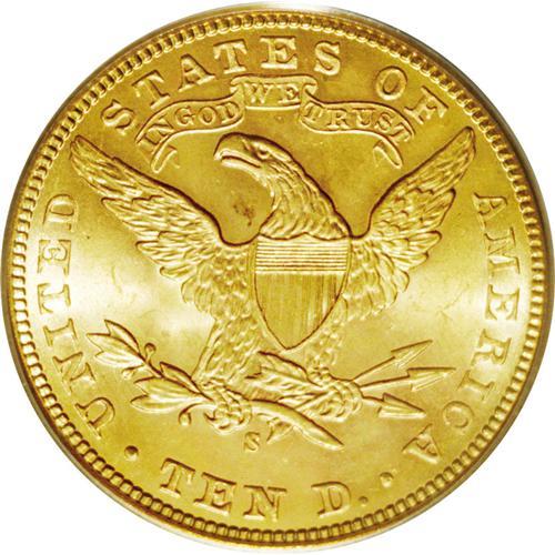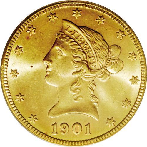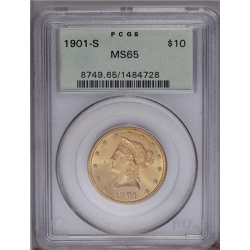 <B>1901-S $10 MS65 PCGS.</B></I> Original and visually impressive with strong mint frost over each side. Well struck throughout, the surfaces display a lovely mixture of reddish-golden color in the centers with light accents of sky-blue at selected protected areas. Exceptionally clean for this normally heavily abraded coin.