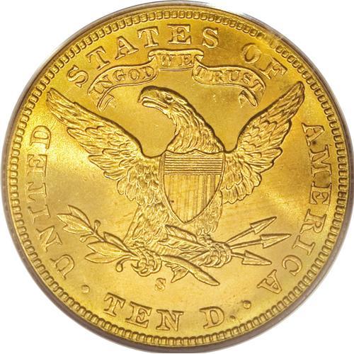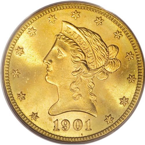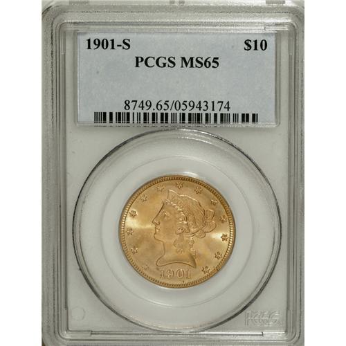 <B>1901-S $10 MS65 PCGS.</B></I> The 1901-S is one of the most common dates in the Liberty half eagle series for two main reasons; its high mintage of 2.8 million pieces and the repatriation of many European hoards. As a result, well over 1000 MS65 or better examples have been graded by the two major grading services. Whatever the reason, numismatists are thankful. Ownership of any Gem Liberty gold coin, regardless of denomination or date, is a satisfying experience. This is a particularly attractive example that has even, deep reddish tinted surfaces. The mint luster is frosted, as usual, and the striking details are fully brought up on each side.<BR><BR><b>Shipping:</b> Coins & Currency (<a target="_blank" href="http://www.heritageauctions.com/common/shipping.php">view shipping information</a>)