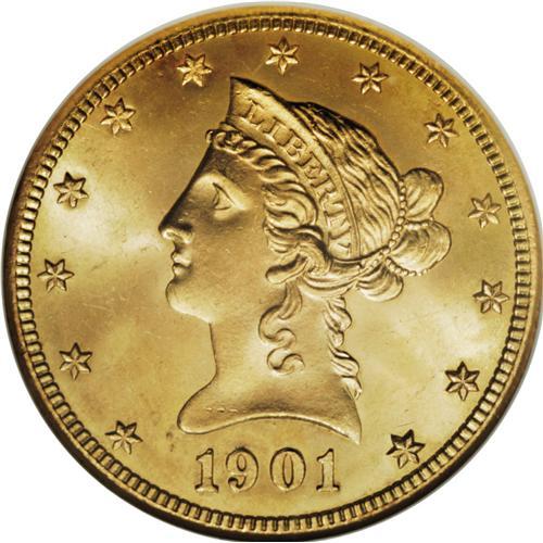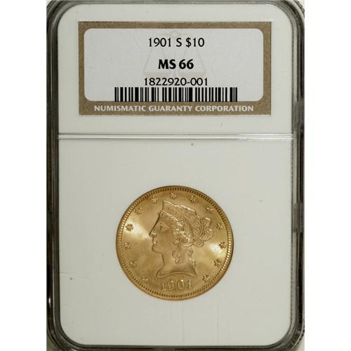 <B>1901-S $10 MS66 NGC.</B></I> An incredible example with highly lustrous satin surfaces and sharp design features. This remarkable piece ranks near the top of the NGC roster. It has lovely pinkish-gold color and pristine surfaces without any distracting blemishes on either side.<BR><BR><b>Shipping:</b> Coins & Currency (<a target="_blank" href="http://www.heritageauctions.com/common/shipping.php">view shipping information</a>)