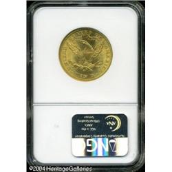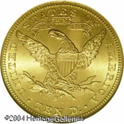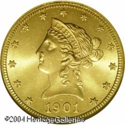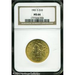1901-S $10 MS66 NGC. An outstanding type coin, the <B>1901-S $10 MS66 NGC.</B></I> An outstanding type coin, the surfaces on this piece have more of a satiny finish rather than the mint frost usually seen. Sharply defined throughout, only the tiniest imperfections are observable with magnification, and the surfaces have even, orange-gold coloration. <BR><BR><B>Important notice:</B> Heritage usually auctions material at the rate of 200-250 lots per hour. On some occasions eBay Live bid software or the Internet may not be able to keep up with the pace of the auction. We recommend placing a realistic absentee bid now as insurance to avoid disappointment. Occasionally the auctioneer may eliminate or reject an eBay Live bid, and the auctioneer may also reopen a lot after the close of the eBay live bidding (usually because we missed an audience bid), and may reject your bid even if it shows you as the winning bidder. By bidding via eBay Live, you agree that Heritage may award the lot to another bidder at its sole discretion under the circumstances described above or any other reasonable circumstances. Since eBay bids are not shown to us until we open the lot on the floor, we treat those bids just like floor bids. In most cases the floor responds before the eBay bid is presented to us, due to Internet lag time, so for consistency we have made it a policy that floor bids are always considered first over tie eBay live bids. Also please note that all Heritage lots purchased through eBay Live carry a 20% Buyer's Premium. Please make sure you read the Terms and Conditions before you bid. This lot is being auctioned in conjunction with a live floor auction by Heritage Galleries & Auctioneers. All final auction and invoice information will be supplied by Heritage Galleries & Auctioneers, and all other information should be considered preliminary. Lot:6786