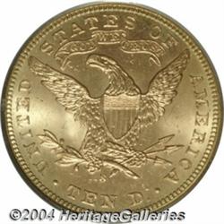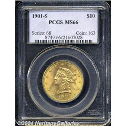 <B>1901-S<$10> MS66 NGC.</B></I> Fully defined in all areas with smooth, nearly blemish-free surfaces. The mint luster is thick and rolls around each side unaffected by any substantial surface disturbances. Even reddish-golden coloration is accented by a very faint blush of lilac around the margins of each side. A common date in uncommonly fine condition. <BR><BR><B>Important notice:</B> Heritage usually auctions material at the rate of 200-250 lots per hour. On some occasions eBay Live bid software or the Internet may not be able to keep up with the pace of the auction. We recommend placing a realistic absentee bid now as insurance to avoid disappointment. Occasionally the auctioneer may eliminate or reject an eBay Live bid, and the auctioneer may also reopen a lot after the close of the eBay live bidding (usually because we missed an audience bid), and may reject your bid even if it shows you as the winning bidder. By bidding via eBay Live, you agree that Heritage may award the lot to another bidder at its sole discretion under the circumstances described above or any other reasonable circumstances. Since eBay bids are not shown to us until we open the lot on the floor, we treat those bids just like floor bids. In most cases the floor responds before the eBay bid is presented to us, due to Internet lag time, so for consistency we have made it a policy that floor bids are always considered first over tie eBay live bids. Also please note that all Heritage lots purchased through eBay Live carry a 20% Buyer's Premium. Please make sure you read the Terms and Conditions before you bid. </span></font></tr></table></td></tr></table>