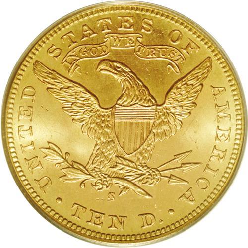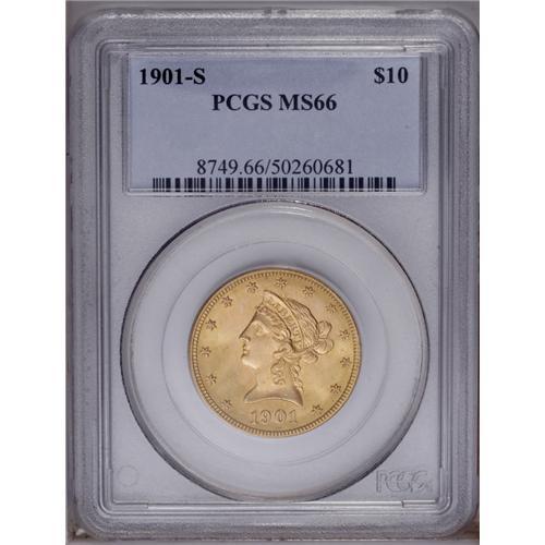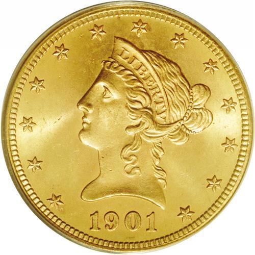 <B>1901-S<$10> MS66 PCGS.</B></I> Green-gold borders encompass rich peach centers. This lustrous and exactingly struck Premium Gem has splendid surfaces and comprehensive eye appeal. A few faint roller marks on the chin are of mint origin. The 1901-S, along with its 1901 and 1907 peers, are the most prevalent issues within the long-lived Liberty type.