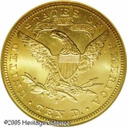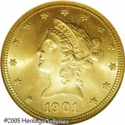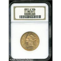 <B>1901-S $10 MS67 NGC.</B></I> A monumental example of this plentiful date in the finest condition yet seen by the two major grading services. Note the textured luster in the fields and the superb quality of the devices and fields where virtually no signs of handling are found. Close examination with a loupe will locate a trivial tick or two, but this coin is far and away finer than virtually all others of this date or type. Toned with hints of bluish-gold near the rims, orange-gold elsewhere offsetting the devices. This is truly an outstanding coin and any collector will be proud to display and own this delightful slice of Americana. Population: 18 in 67, 0 finer (1/05). Lot:8829