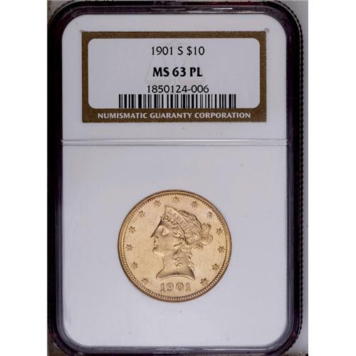 <B>1901-S<$10> MS63 Prooflike NGC.</B></I> Breen-7075. The base of the first 1 in the date is boldly repunched. The 1901-S is the most common issue of the type in better Mint State grades, but it remains scarce with Prooflike fields. This well struck piece has only one mentionable mark, near Liberty's jaw. Census: 6 in 63 Prooflike, 1 finer (2/06).
