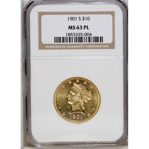 <B>1901-S $10 MS63 Prooflike NGC.</B></I> Bright brassy-gold surfaces project considerable "flash." Sharply defined motifs are nicely highlighted by prooflike fields. A higher grade is precluded by an even distribution of light marks. While common in Mint State, the 1901-S is quite scarce in prooflike. Census: 9 in 63 Prooflike, 1 finer (11/06).<BR><BR><b>Shipping:</b> Coin/Currency (<a target="_blank" href="http://www.heritageauctions.com/common/shipping.php">view shipping information</a>)