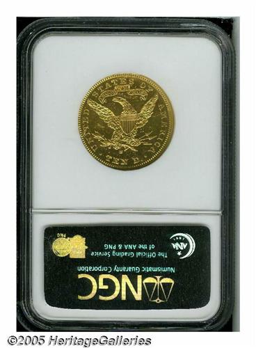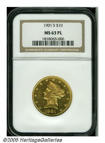 <B>1901-S<$10> Prooflike MS63 NGC.</B></I> The 1901-S is the most available Liberty Eagle at the Gem level, but true prooflikes are few and far between. An intricately struck piece with pleasing field reflectivity and a few light file marks on the rim. Population: 4 in 63 Prooflike, 1 finer (4/05).