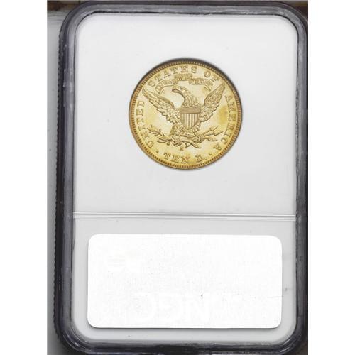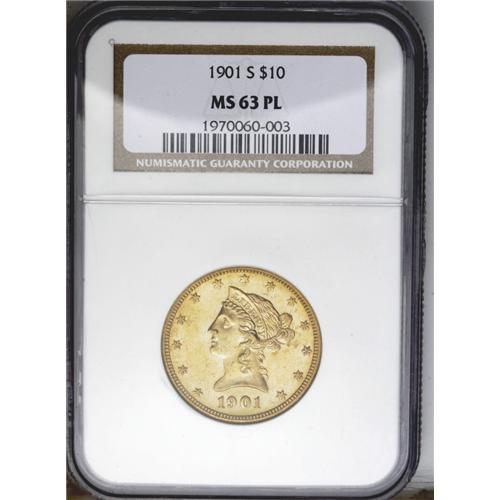<B>1901-S<$10> Prooflike MS63 NGC.</B></I> The beautifully glassy fields are dark and highly reflective on both sides of the coin. Rich apricot-orange and mint-green toning increases the visual appeal of the piece. Numerous tiny contact marks define the grade. Extremely scarce in fully Prooflike condition. Census: 9 in 63 Prooflike, 1 finer (6/06).