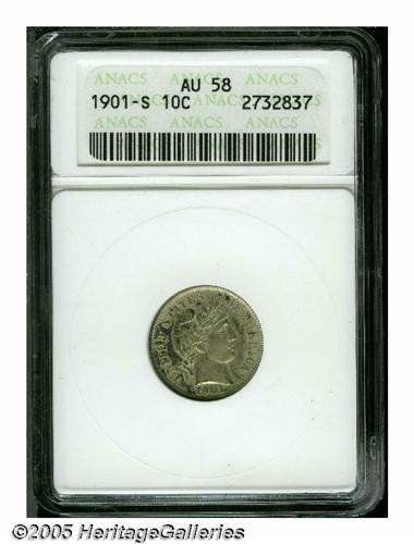 <B>1901-S<10C> AU58 ANACS.</B></I> Smooth surfaces exhibit light gray patina with splashes of sky-blue and golden brown on the obverse, and traces of luster in the recessed areas. The design elements are adequately struck throughout.<BR><I>From The Empire State Collection, Part Two.</B></I>